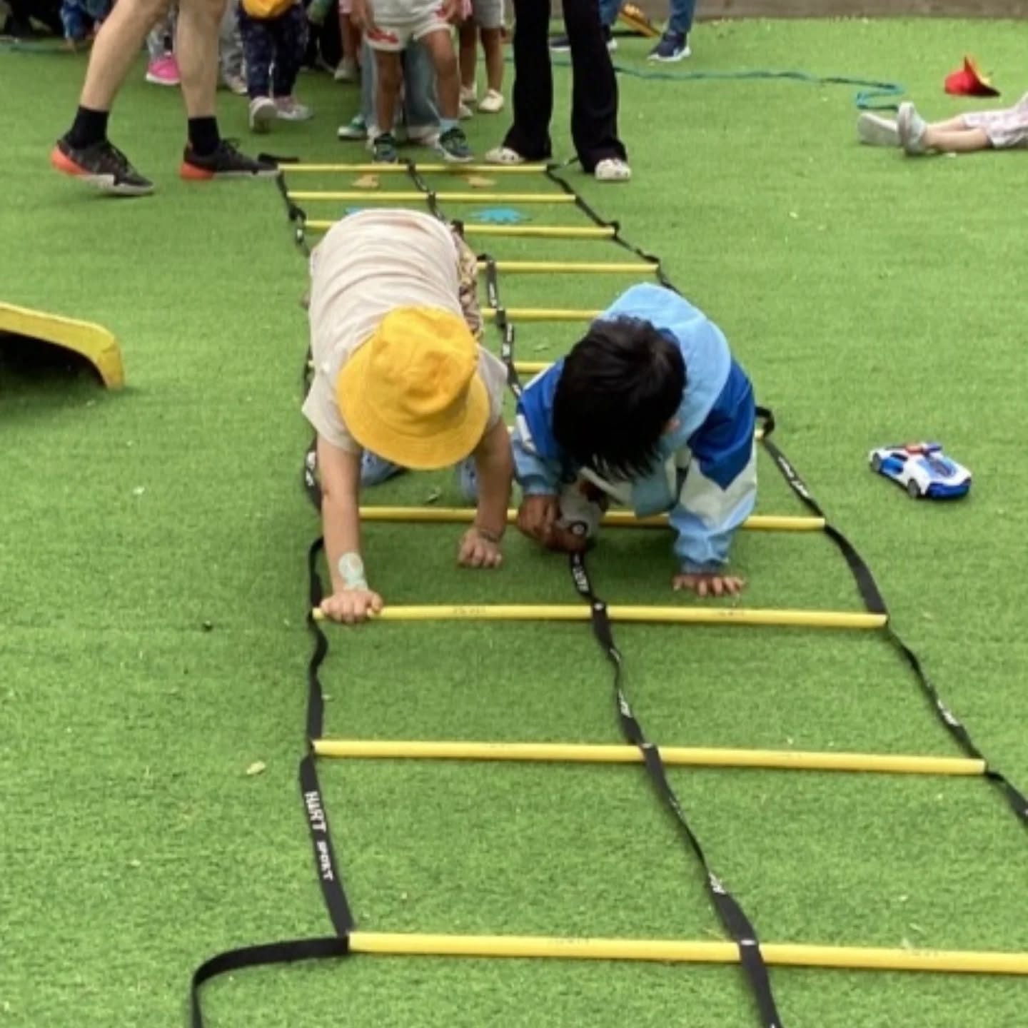 After watching Don’s demonstration, the children took turns stepping and crawling through the ladder, showing determination and excitement