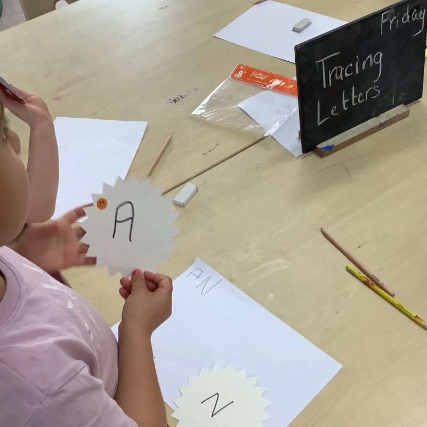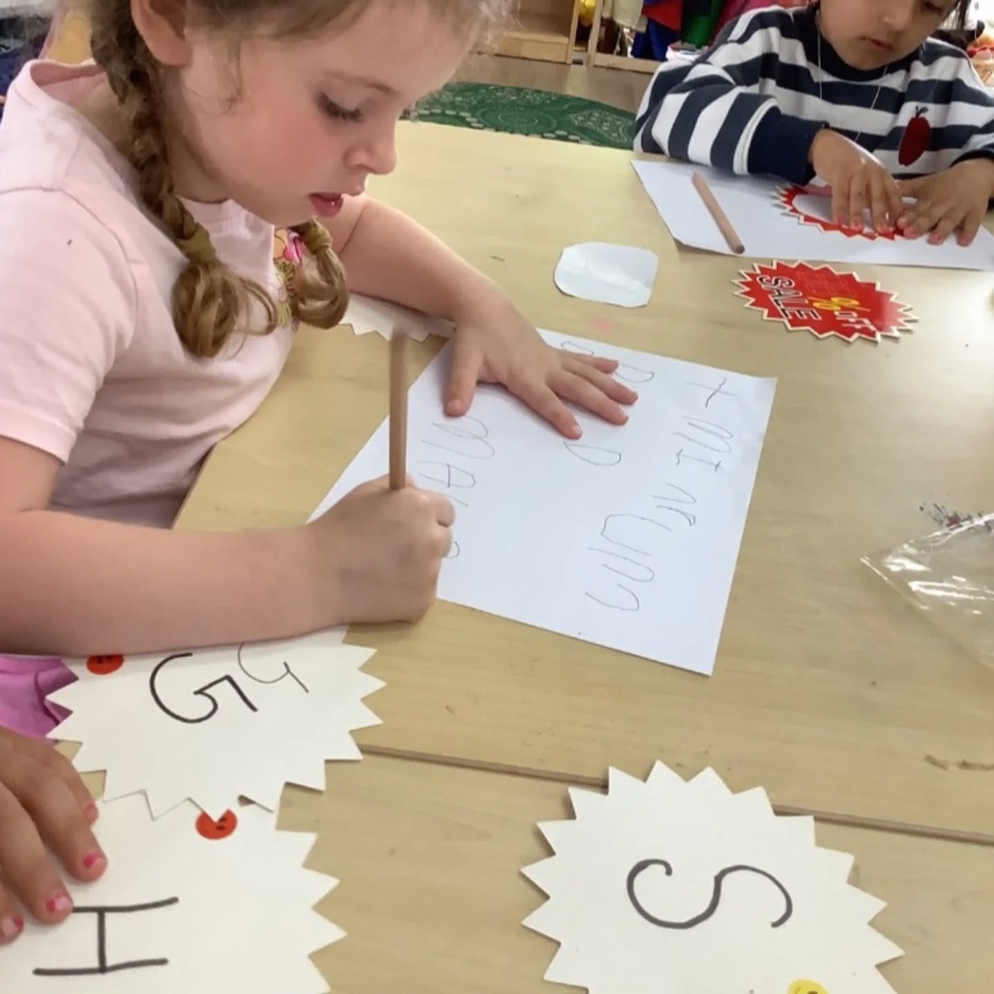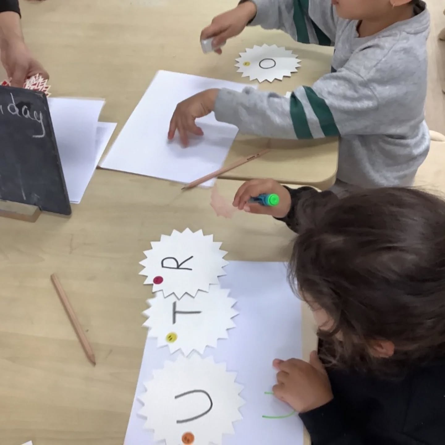 Today, our 4-year-old Kinder children engaged in a focused literacy experience that encouraged their growing interest in letters and writing. On the table, we set out alphabet flashcards for the children to choose from, along with pencils and paper for writing practice.