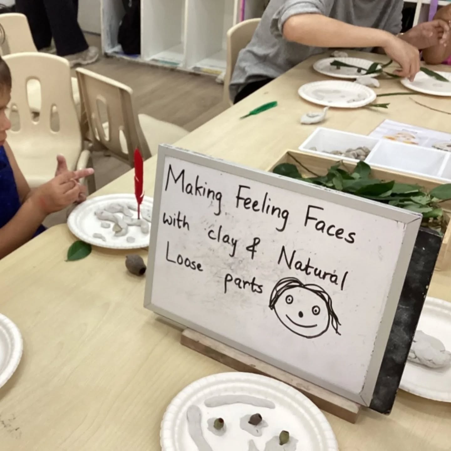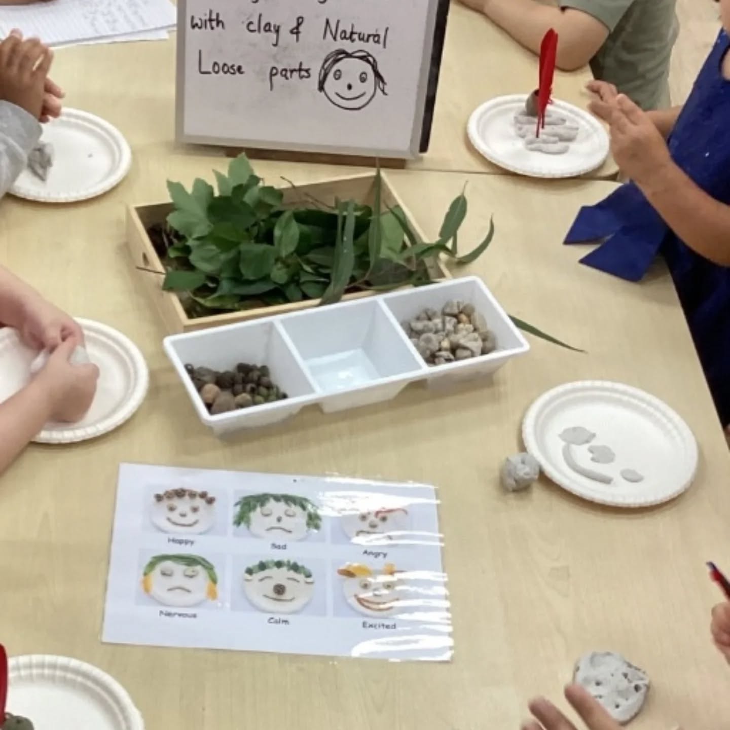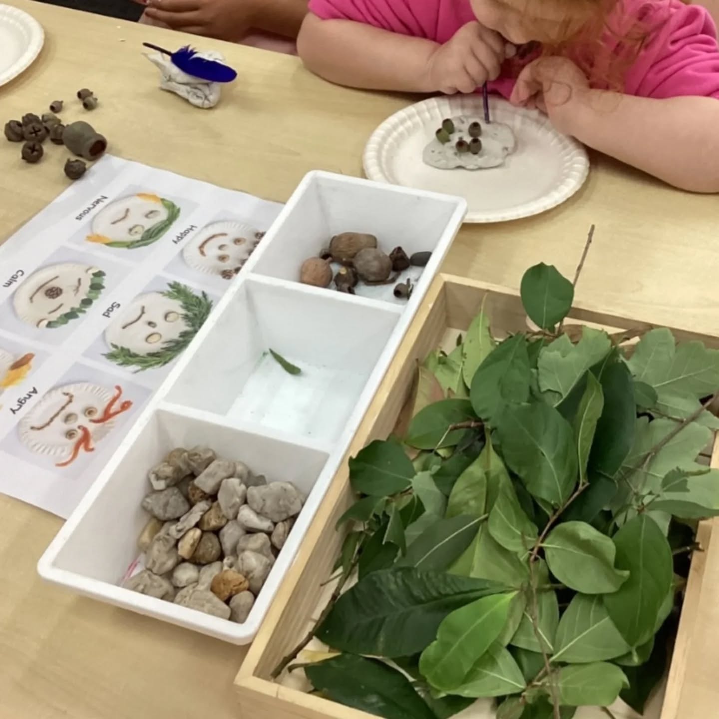 After watching a short story about Our Feelings, we began with a feelings check-in activity where children chose a face puppet and shared how they were feeling. We then extended the learning into a hands-on sensory experience using natural materials like rocks, gum nuts, sticks, leaves, and clay