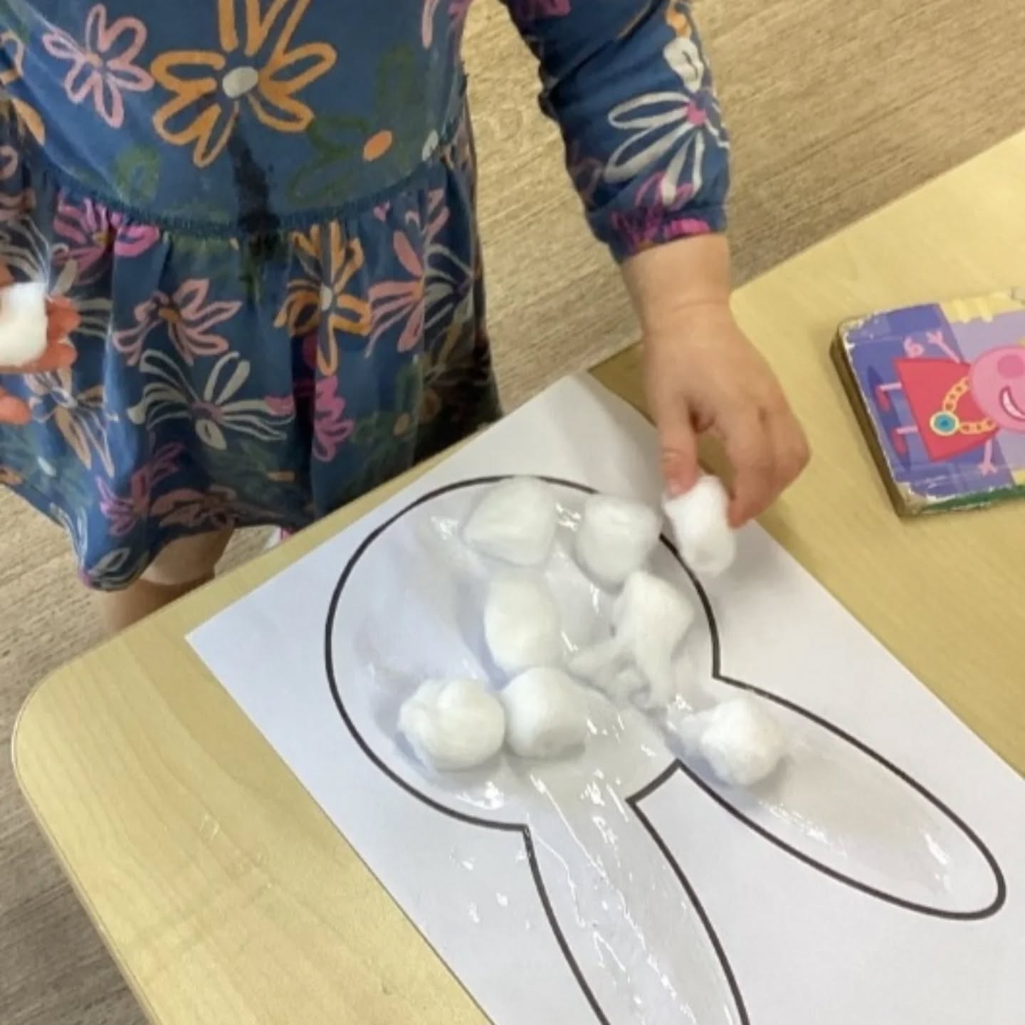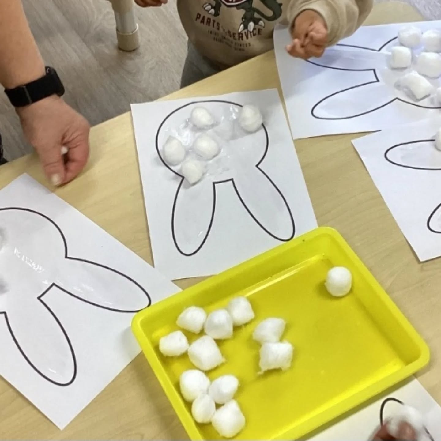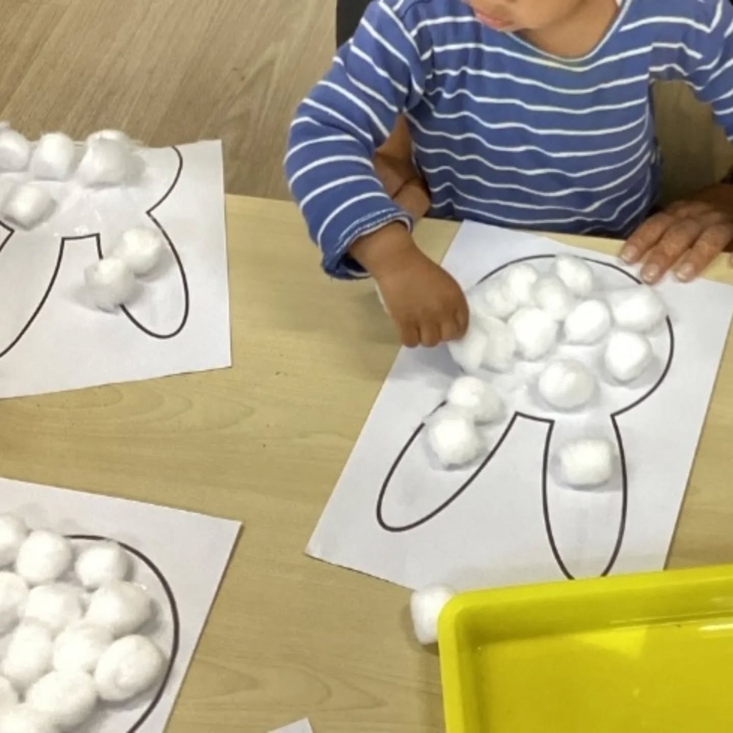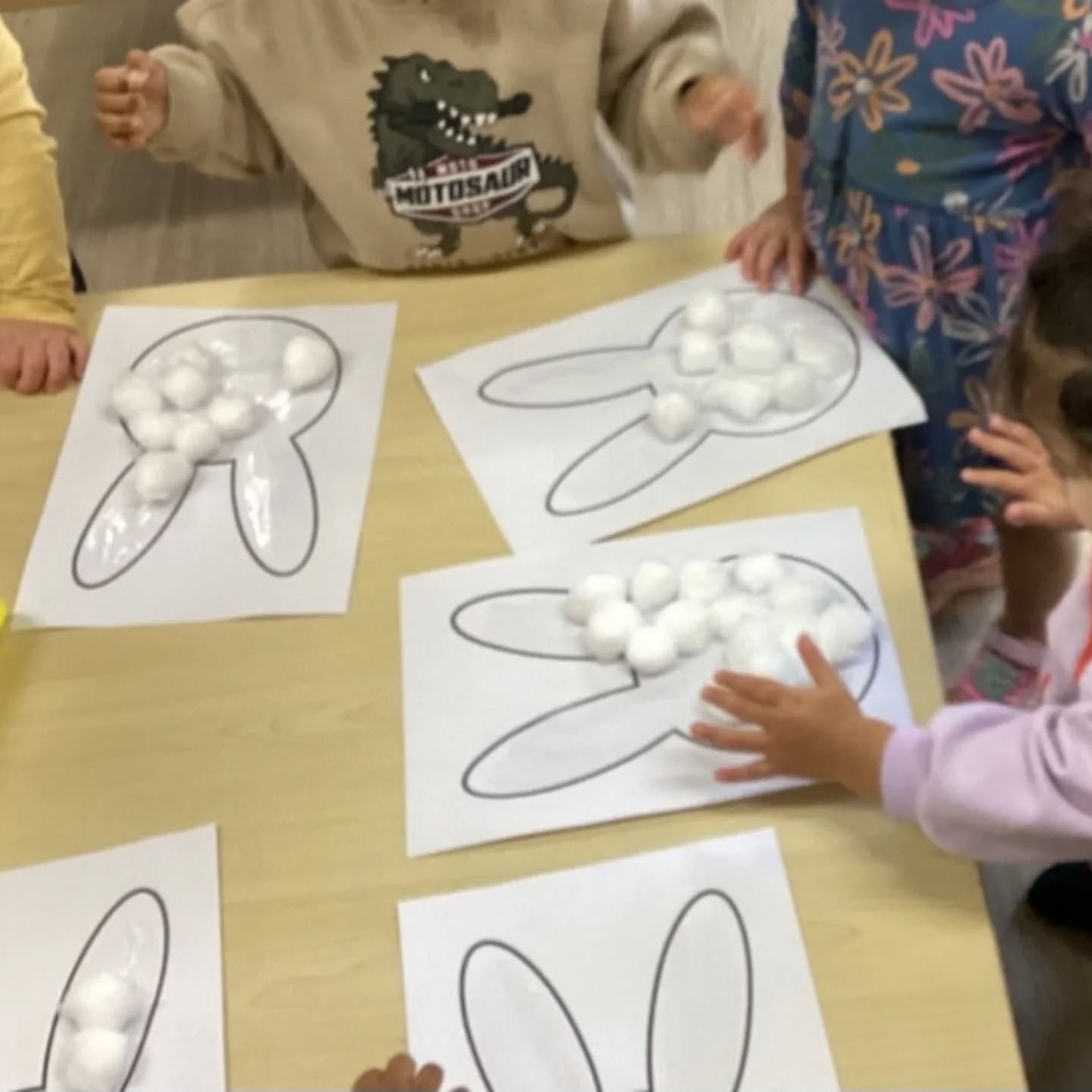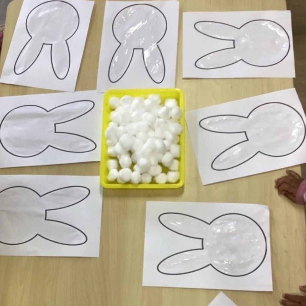 We created a cute bunny outline and provided soft, fluffy cotton balls for the babies to explore and use. As soon as they saw the setup, their curiosity sparked