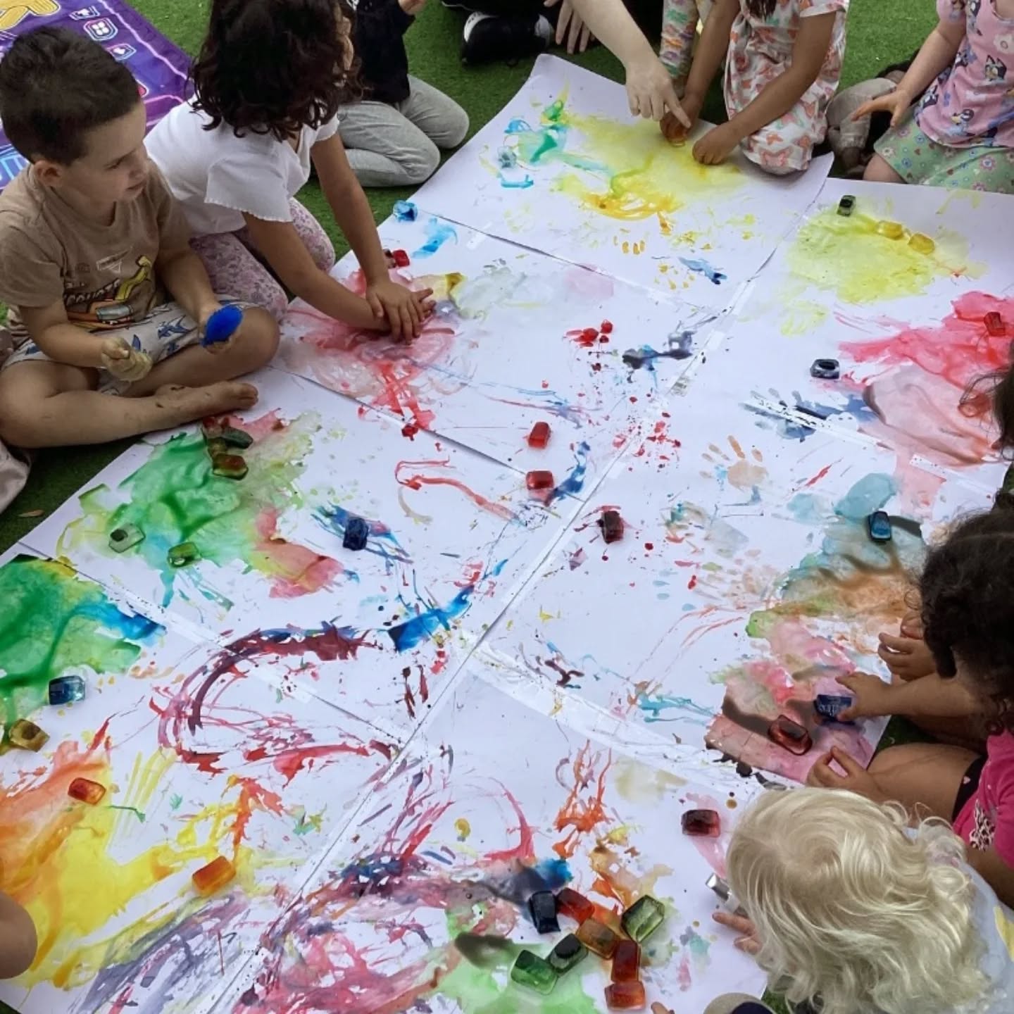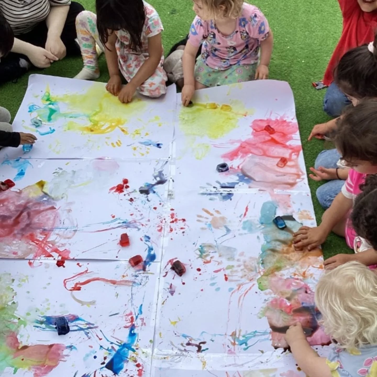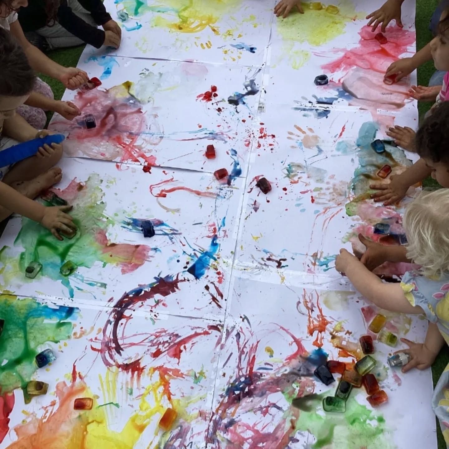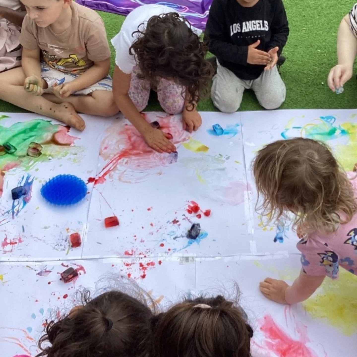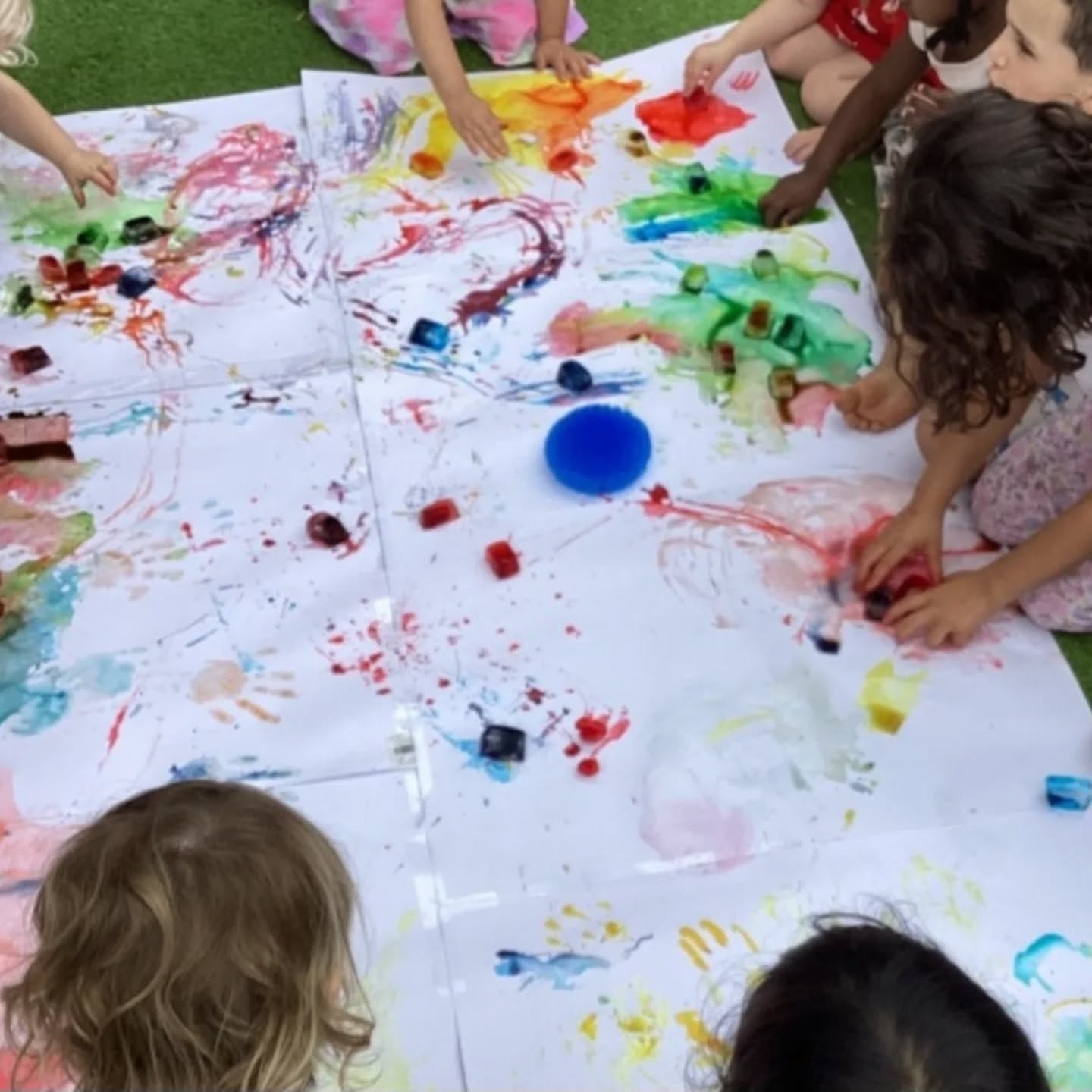 Our educators created a wonderful outdoor painting experience using large sheets of paper and colourful ice cubes. The children were instantly curious and excited to explore!