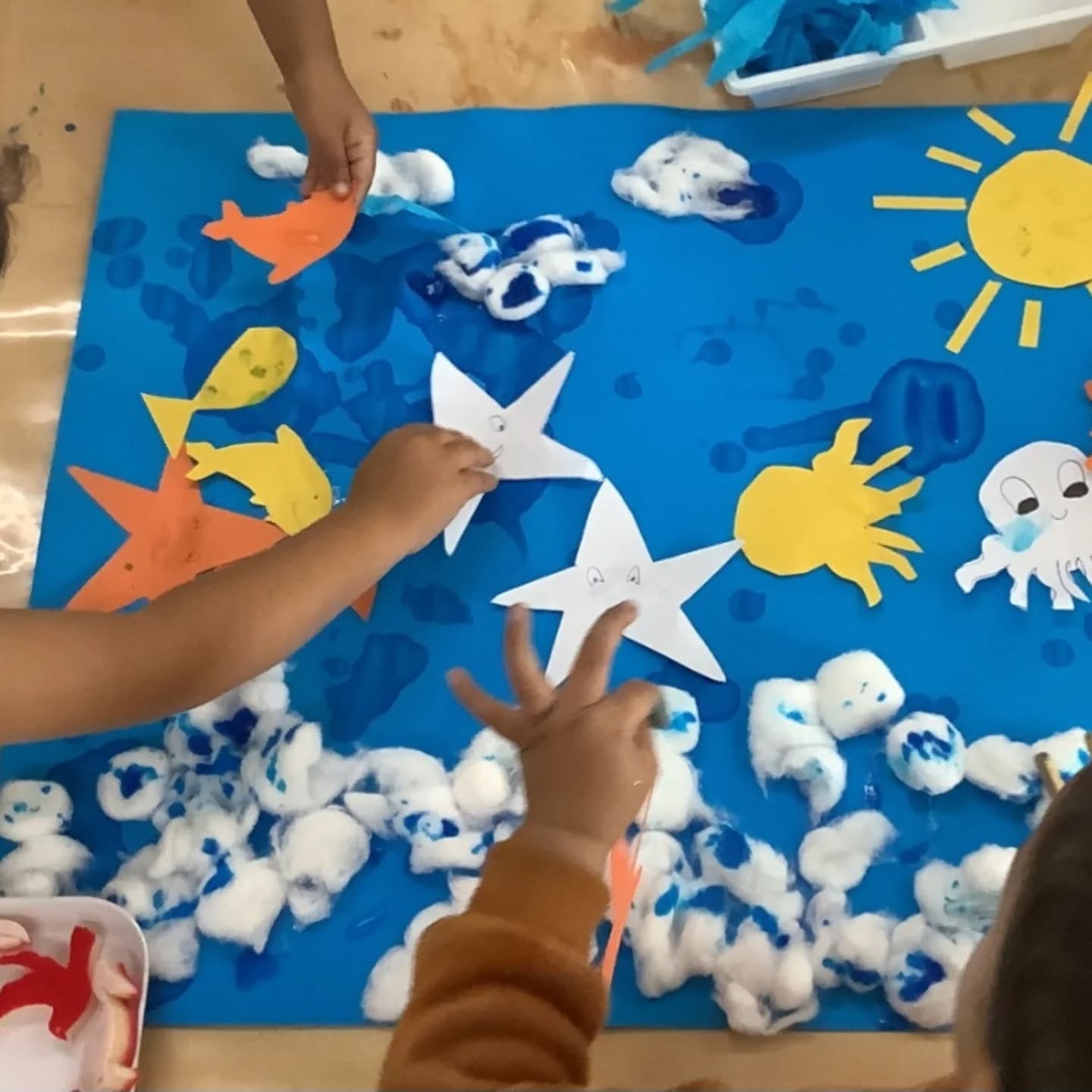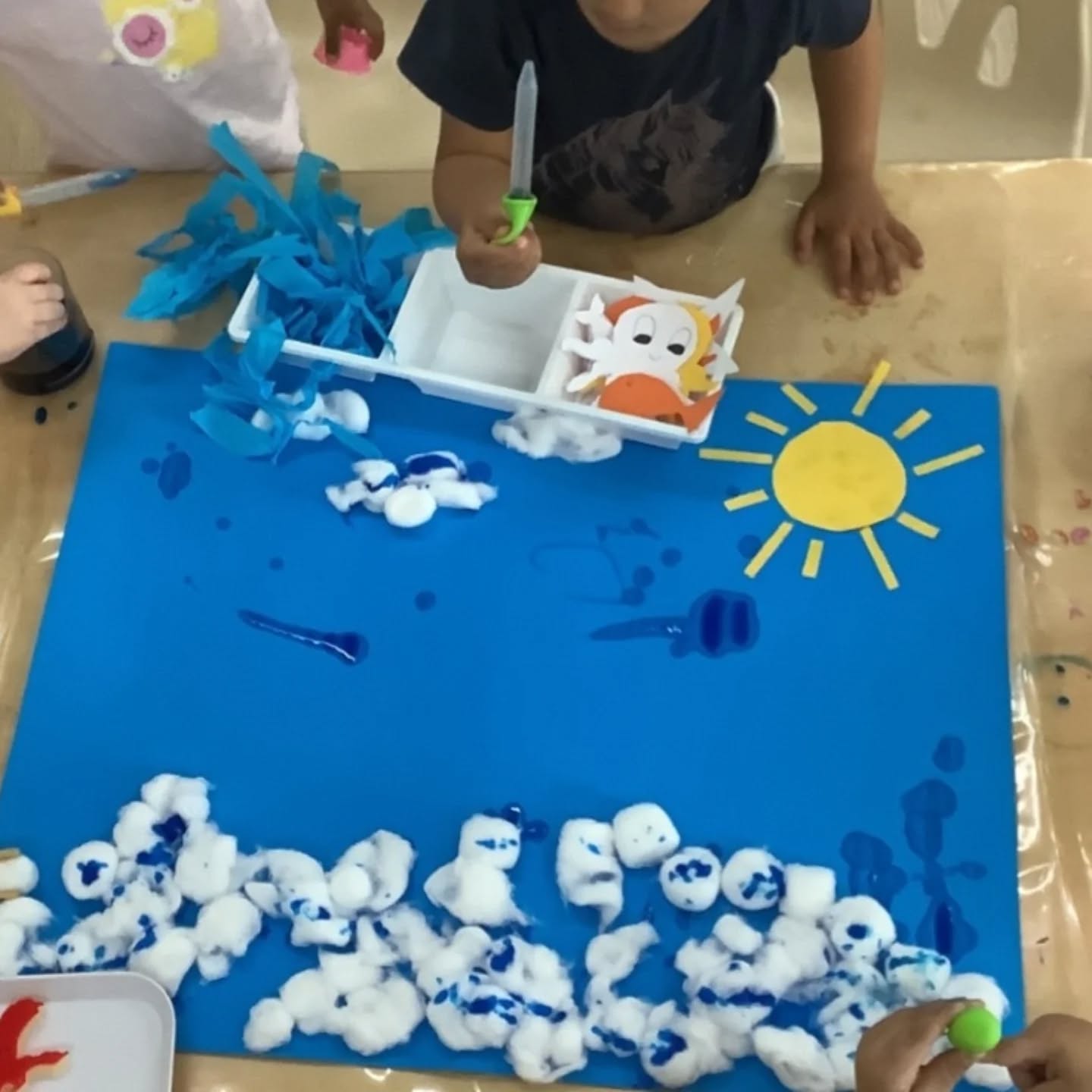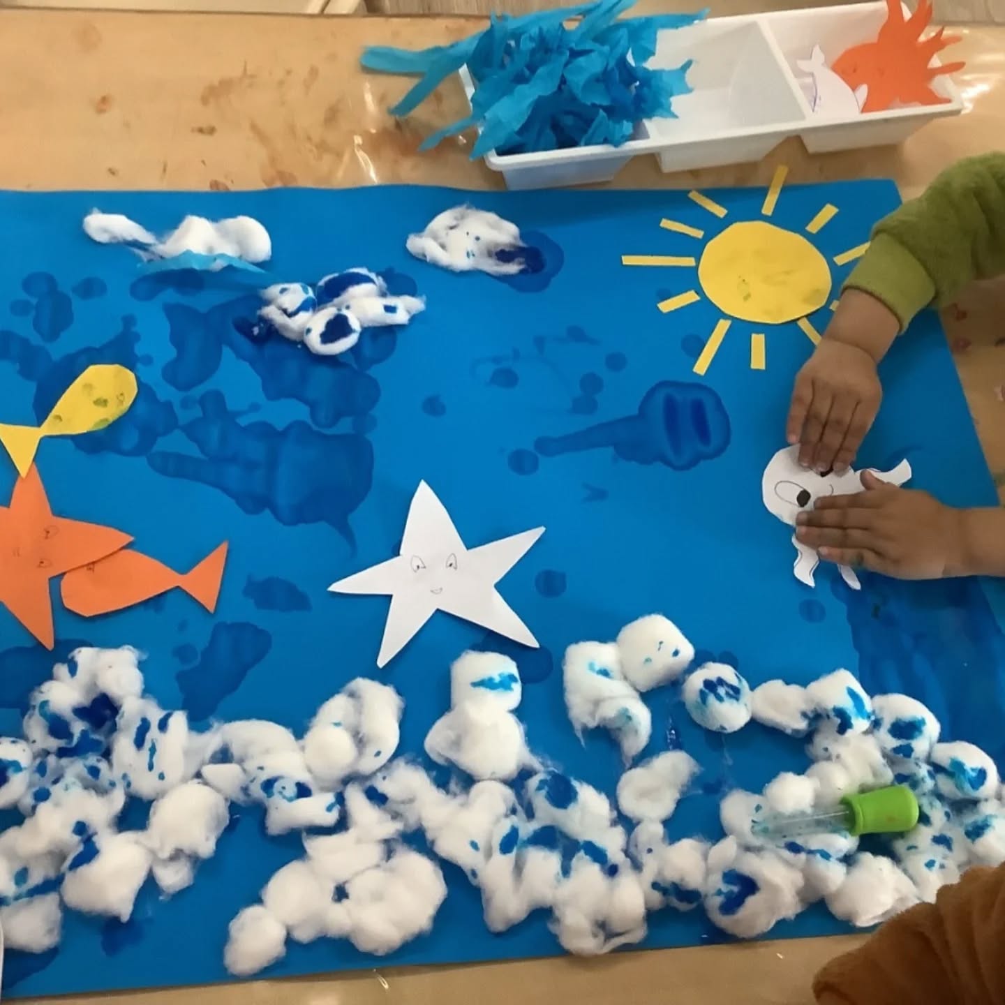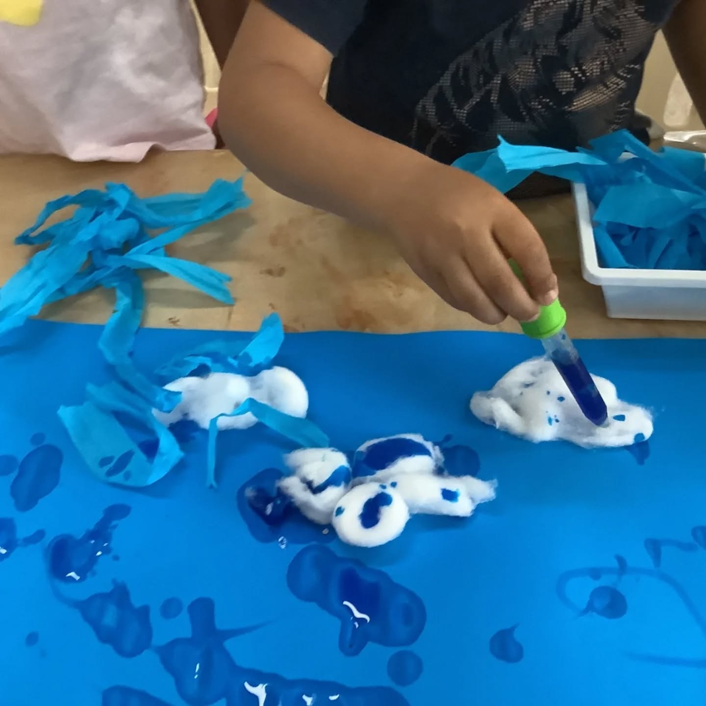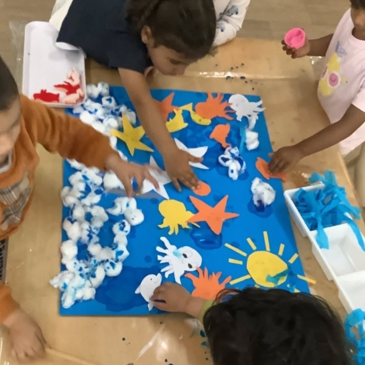 This week, our toddlers enjoyed a beautiful sea life art experience, decorating ocean scenes using blue paint, cotton balls, and droppers. This Montessori-influenced activity encouraged choice, independence, and concentration, while also supporting fine motor skills and sensory exploration.