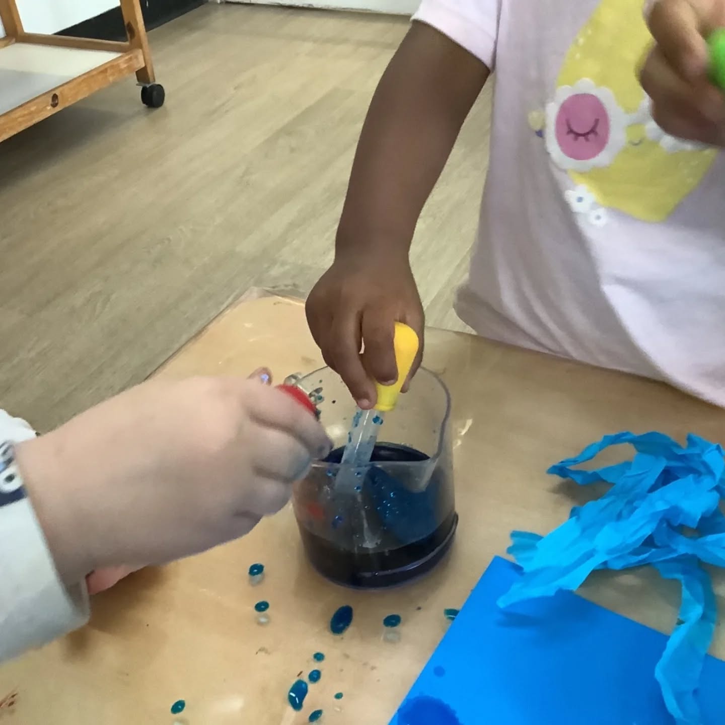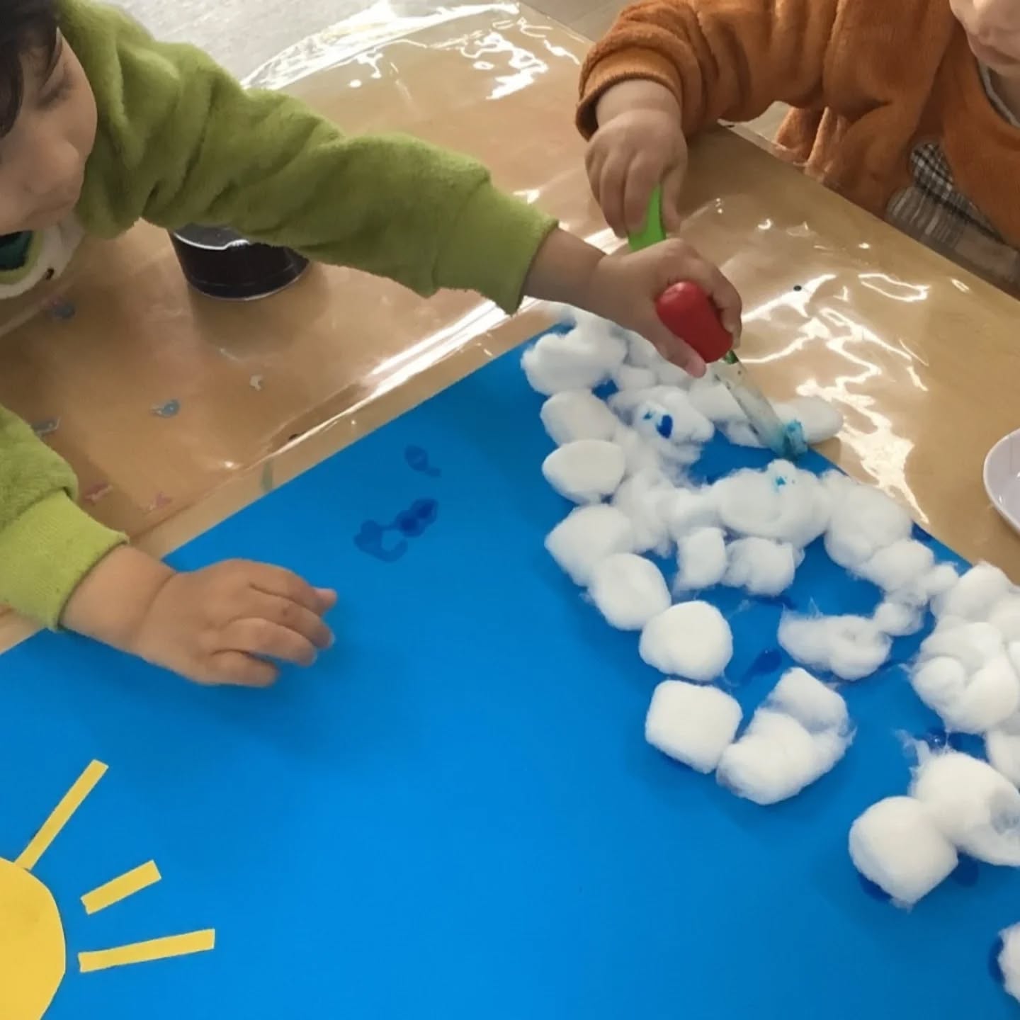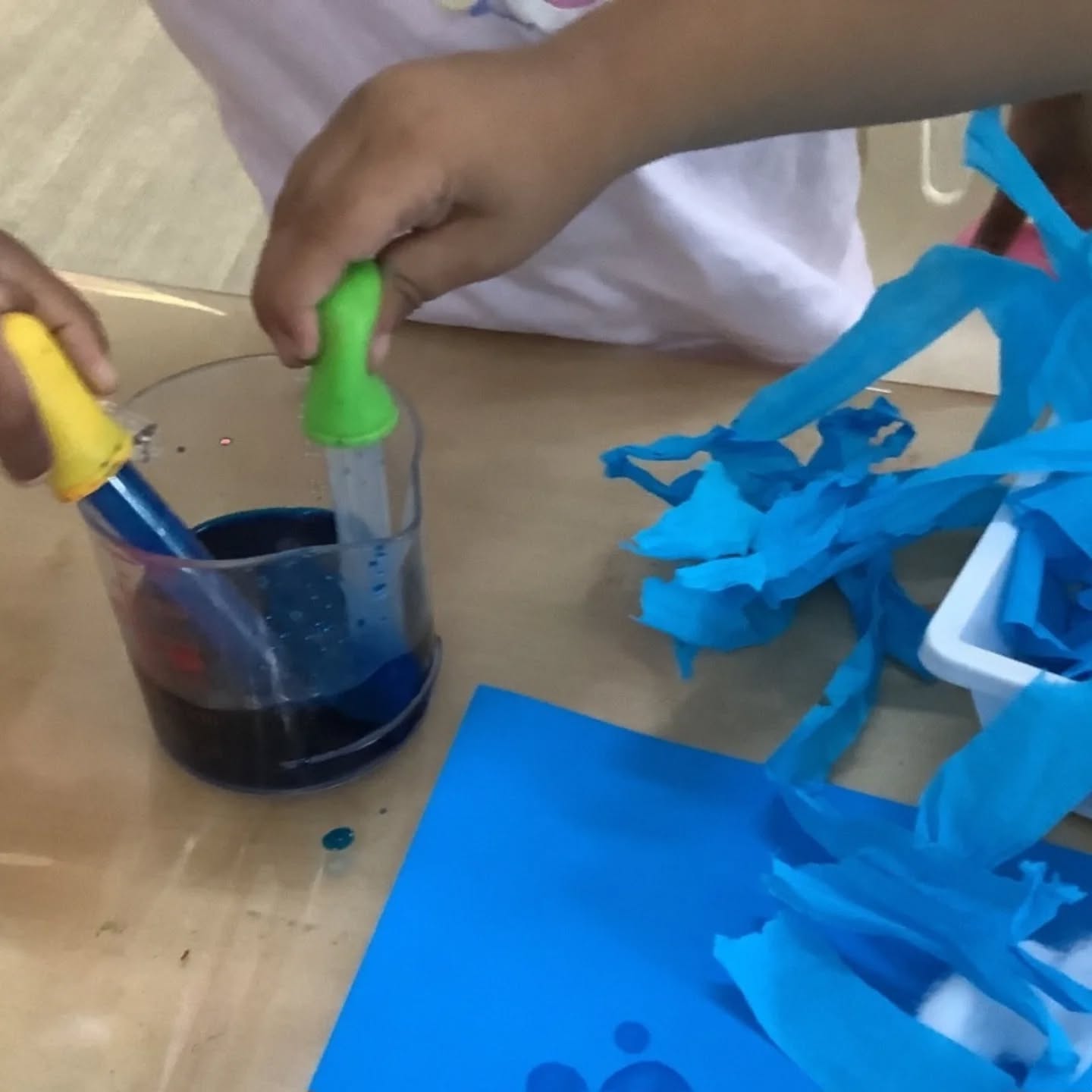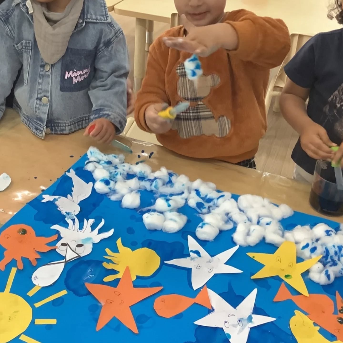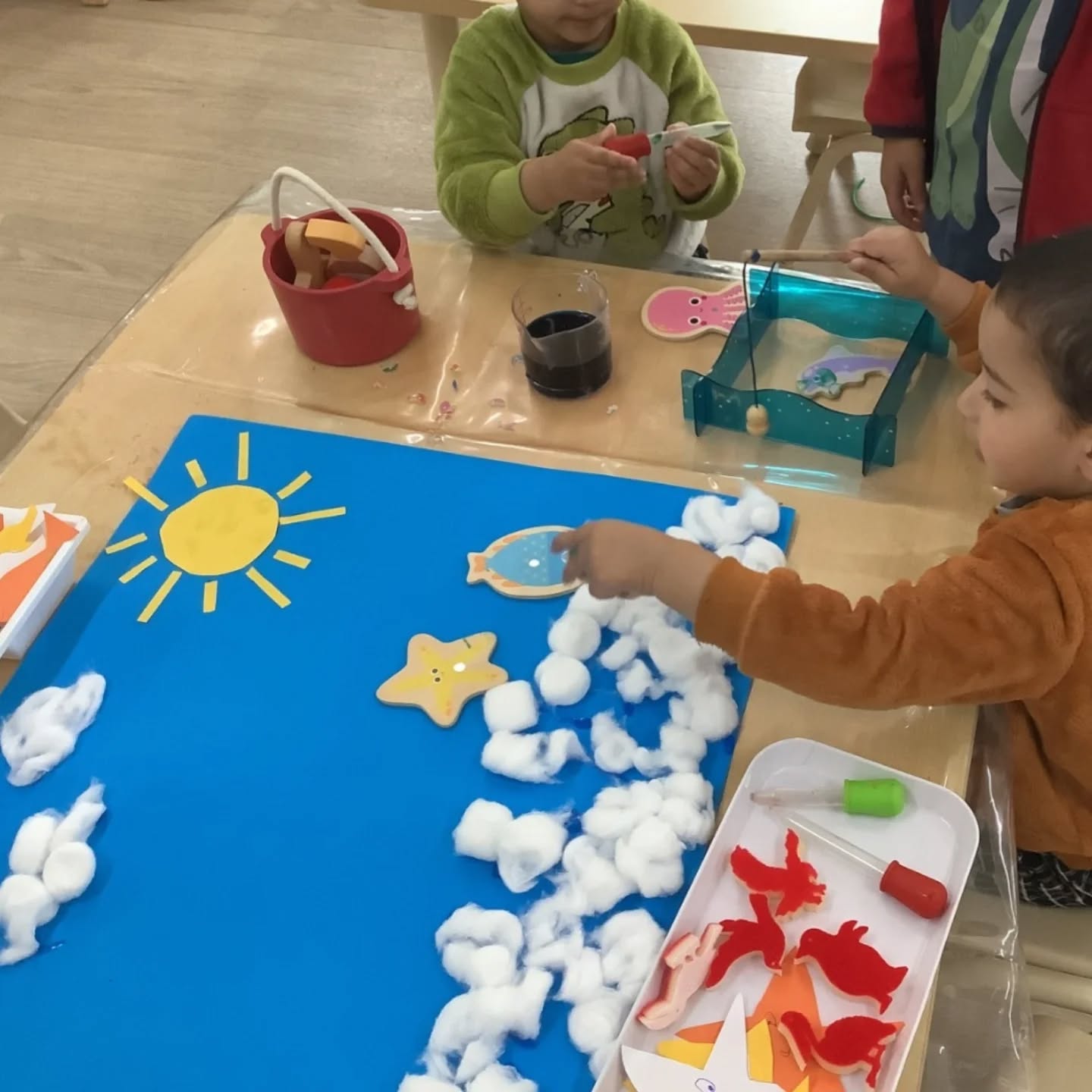 This week, our toddlers enjoyed a beautiful sea life art experience, decorating ocean scenes using blue paint, cotton balls, and droppers. This Montessori-influenced activity encouraged choice, independence, and concentration, while also supporting fine motor skills and sensory exploration.