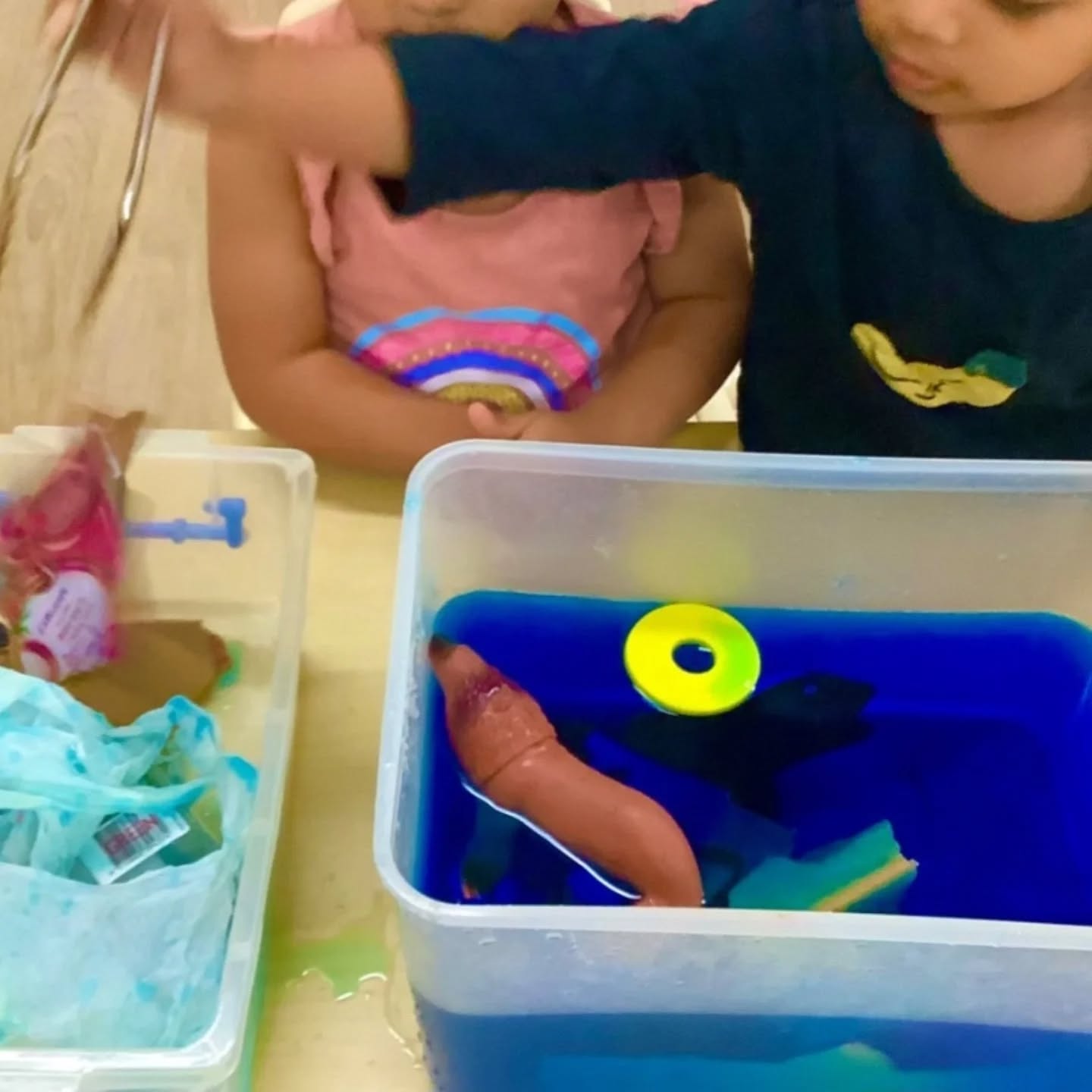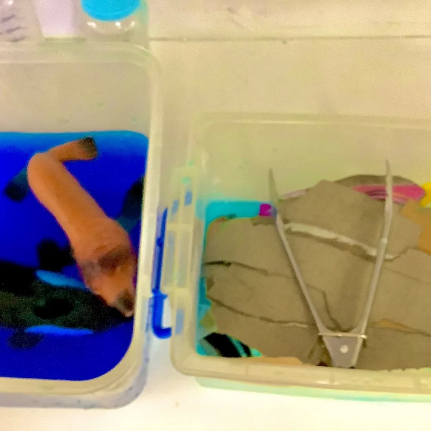 One tub was filled with water, sea animals, and pieces of “rubbish” like wrappers and plastic bottles ![]()